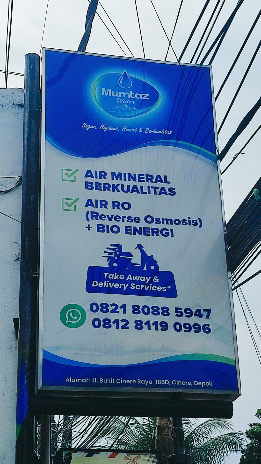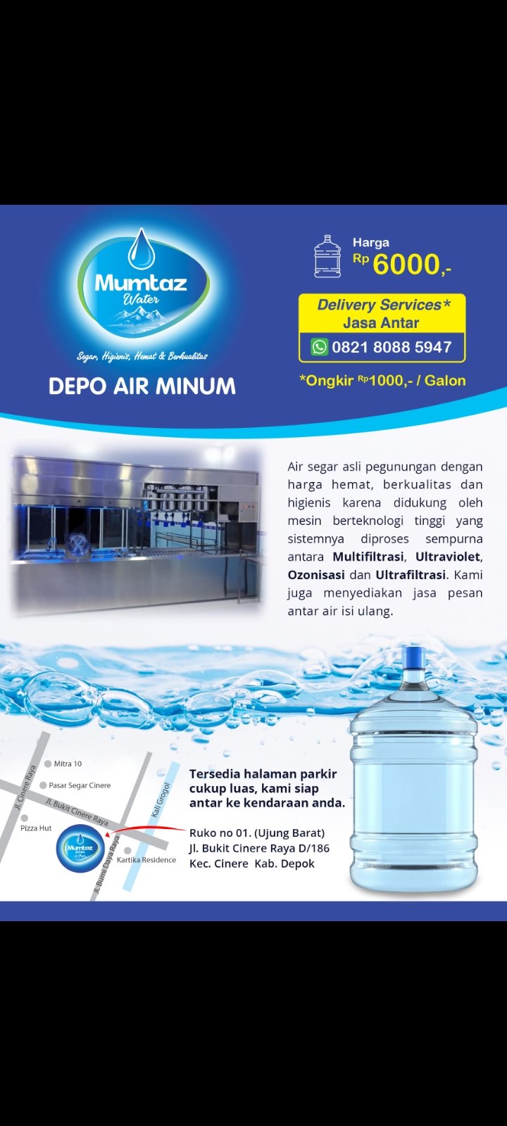 Mumtaz Water - Depo Air Minum berlokasi di Cinere Nikmati air isi ulang berkualitas tinggi dari Mumtaz Water, Depo Air Minum berlokasi di Cinere: - Telah disertifikasi oleh Dinas Kesehatan Depok (Sertifikat Laik Higiene Sanitasi) - Teruji laboratorium - Bahan baku air pegunungan asli - Legalitas usaha terjamin (Anggota Asdamindo) Kami juga menawarkan layanan delivery untuk kenyamanan anda. Jaga kesehatan keluarga dengan air minum yang bersih dan sehat, serta kesegaran yang sudah terbukti!
